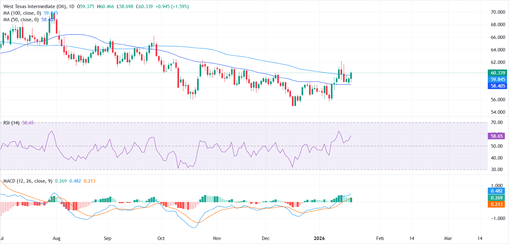 مدد خام غرب تكساس الوسيط (WTI) انتعاشه يوم الثلاثاء، مستفيدًا بشكل طفيف من تجدد المخاوف بشأن الإمدادات بعد انقطاع الإنتاج الذي أثر على تدفقات النفط من حقل تنغيز في كازاخستان. في وقت كتابة هذا التقرير، يتداول خام غرب تكساس الوسيط بالقرب من 60.33 دولار، مرتفعًا بنحو 1.6% خلال اليوم.