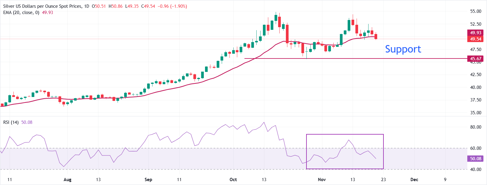 تواجه أسعار الفضة صعوبة من أجل الصمود فوق المتوسط المتحرك الأسي 20 يومًا، والذي يتداول حول منطقة 49.50 دولار.