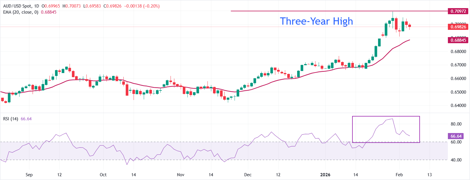 يتم تداول زوج دولار أسترالي/دولار أمريكي AUD/USD على انخفاض حول منطقة 0.6982 خلال وقت كتابة هذا التقرير. يرتفع المتوسط المتحرك الأسي 20 يومًا بشكل مستقر، مما يُبرز اتجاهًا صاعداً راسخاً. تصمد الأسعار فوق المتوسط المتحرك الأسي 20 يومًا، مع توفير المتوسط المتحرك الأسي 20 يوماً عند منطقة 0.6884 دعمًا أوليًا.
