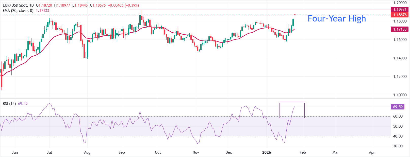 تنازل الدولار الأمريكي عن مكاسبه السنوية في تحول غير متوقع. تضغط عوامل غرينلاند، والتجارة بين الولايات المتحدة والاتحاد الأوروبي، وترامب جميعها على الدولار الأمريكي. من المتوقع على نطاق واسع أن يترك الاحتياطي الفيدرالي أسعار الفائدة دون تغيير.