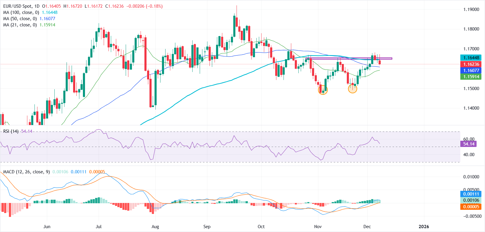 - تسلط الإعدادات الفنية الضوء على مقاومة قوية عند 1.1650، بينما توفر المتوسطات المتحركة البسيطة لمدة 21 و50 يومًا دعماً للاتجاه الهبوطي.