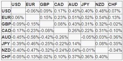 تُظهر الخريطة الحرارية التغيرات المئوية للعملات الرئيسية في مقابل بعضها البعض. يتم اختيار العملة الأساسية من العمود الأيسر، بينما يتم اختيار عملة التسعير من الصف العلوي. على سبيل المثال، إذا اخترت اليورو من العمود الأيسر وتحركت على طول الخط الأفقي إلى الين الياباني، فإن النسبة المئوية للتغير المعروض في المربع سوف تمثل زوج يورو EUR (الأساس) / ين JPY (التسعير).