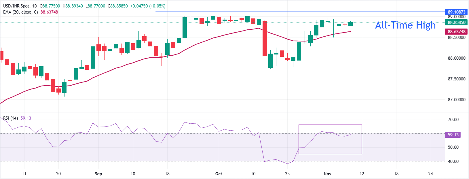 يبقى زوج USD/INR محصورًا في نطاق ضيق بالقرب من 88.85. يبقى الزوج فوق المتوسط المتحرك الأسي لمدة 20 يومًا (EMA)، الذي يتداول حول 88.63.