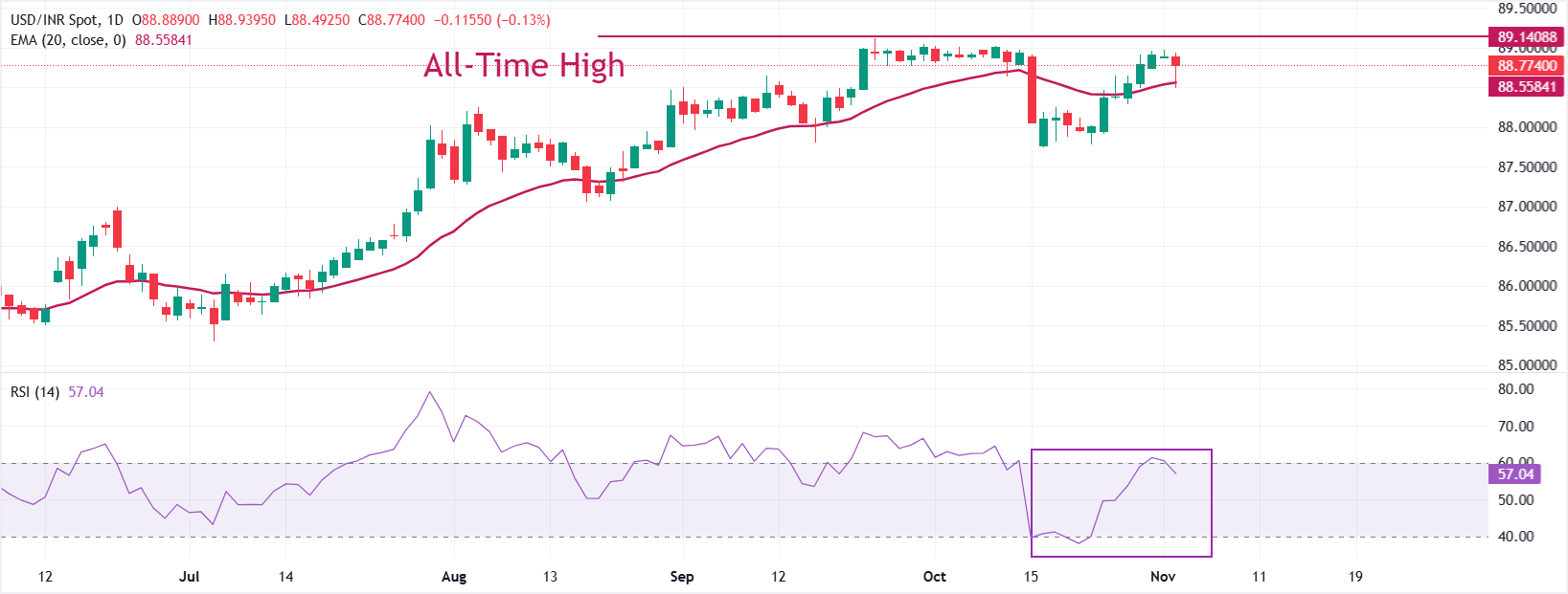يتعافى زوج USD/INR من خسائره المبكرة ويعود إلى ما يقرب من 88.80 في النصف الثاني من ساعات التداول الهندية يوم الثلاثاء. يرتد الزوج بعد جذب طلبات شراء بالقرب من المتوسط المتحرك الأسي (EMA) لمدة 20 يومًا، والذي يتم تداوله حول 88.54.