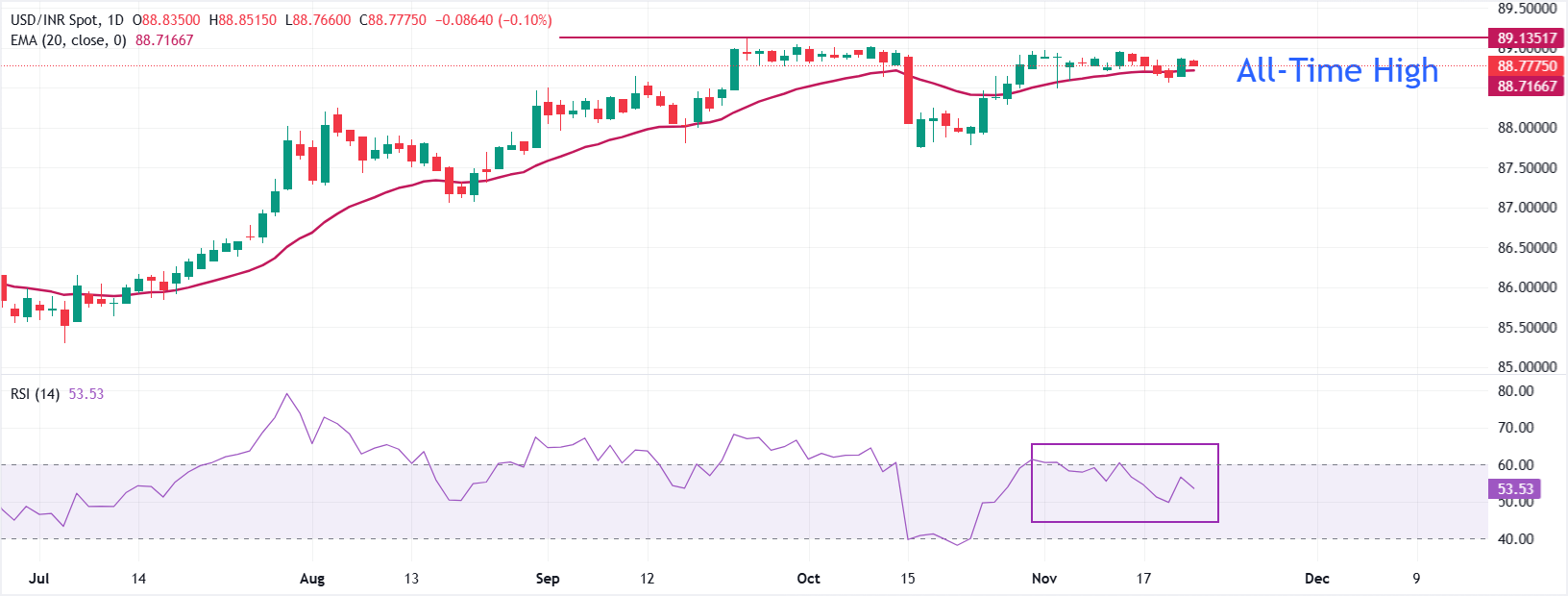 انخفض زوج USD/INR إلى قرب 88.80 عند الافتتاح يوم الجمعة. يستمر المتوسط المتحرك الأسي (EMA) لمدة 20 يومًا بالقرب من 88.70 في العمل كدعم رئيسي للمضاربين على ارتفاع الدولار الأمريكي.