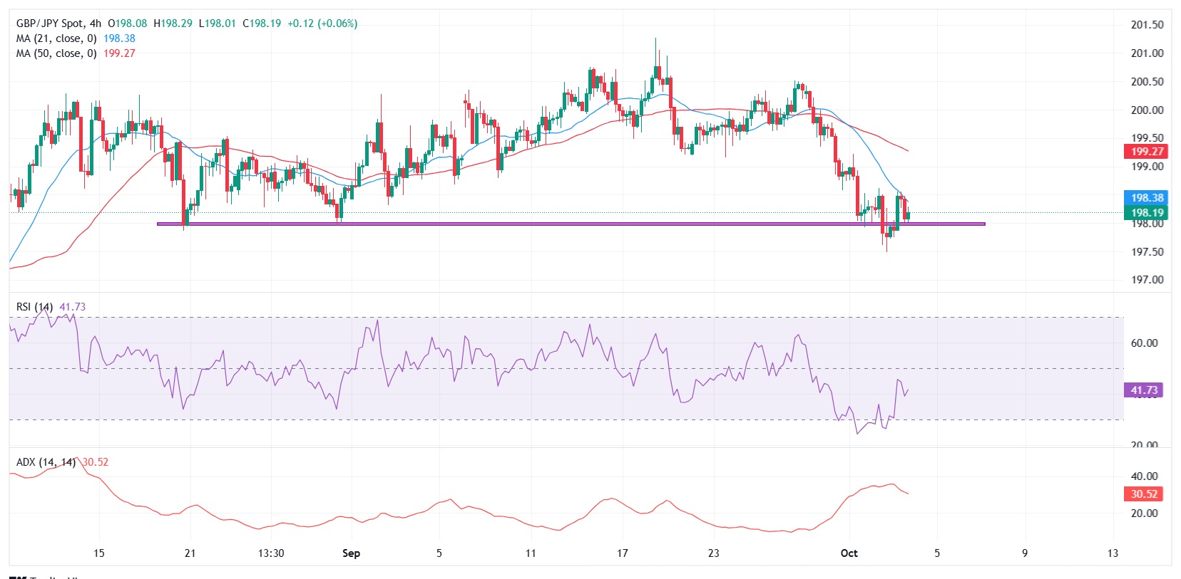 يستقر زوج استرليني/ين GBP/JPY يوم الجمعة، ليوقف سلسلة خسائر استمرت أربعة أيام بعد أن انخفض إلى أدنى مستوى له منذ 7 أغسطس/آب يوم الخميس. في وقت كتابة هذا التقرير، يتمسك الزوج بالقرب من مستوى 198.00، متراجعًا من أعلى مستوياته خلال اليوم قرب 198.55.